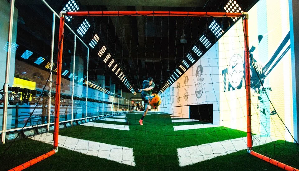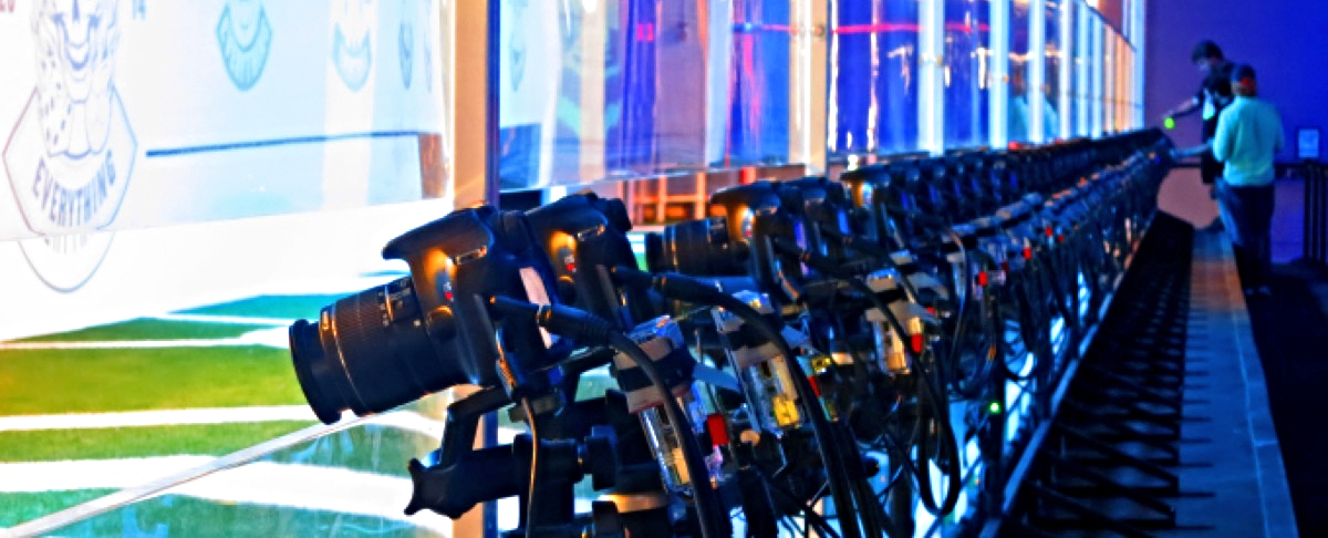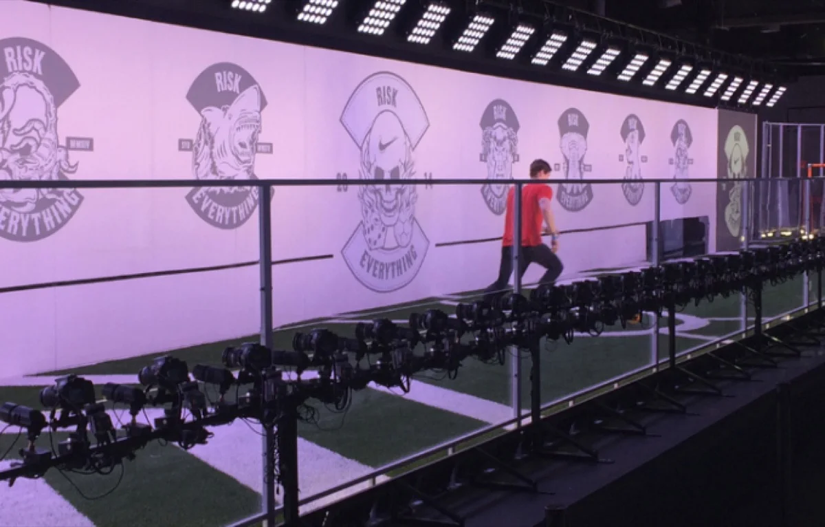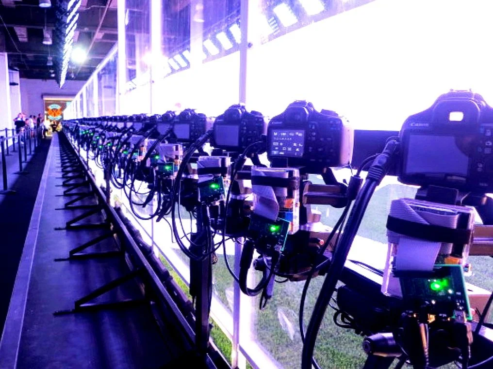 A 120-camera rig of networked Canon DSLRs capturing a ‘bullet-time’ effect of users dribbling a ball and shooting on goal.