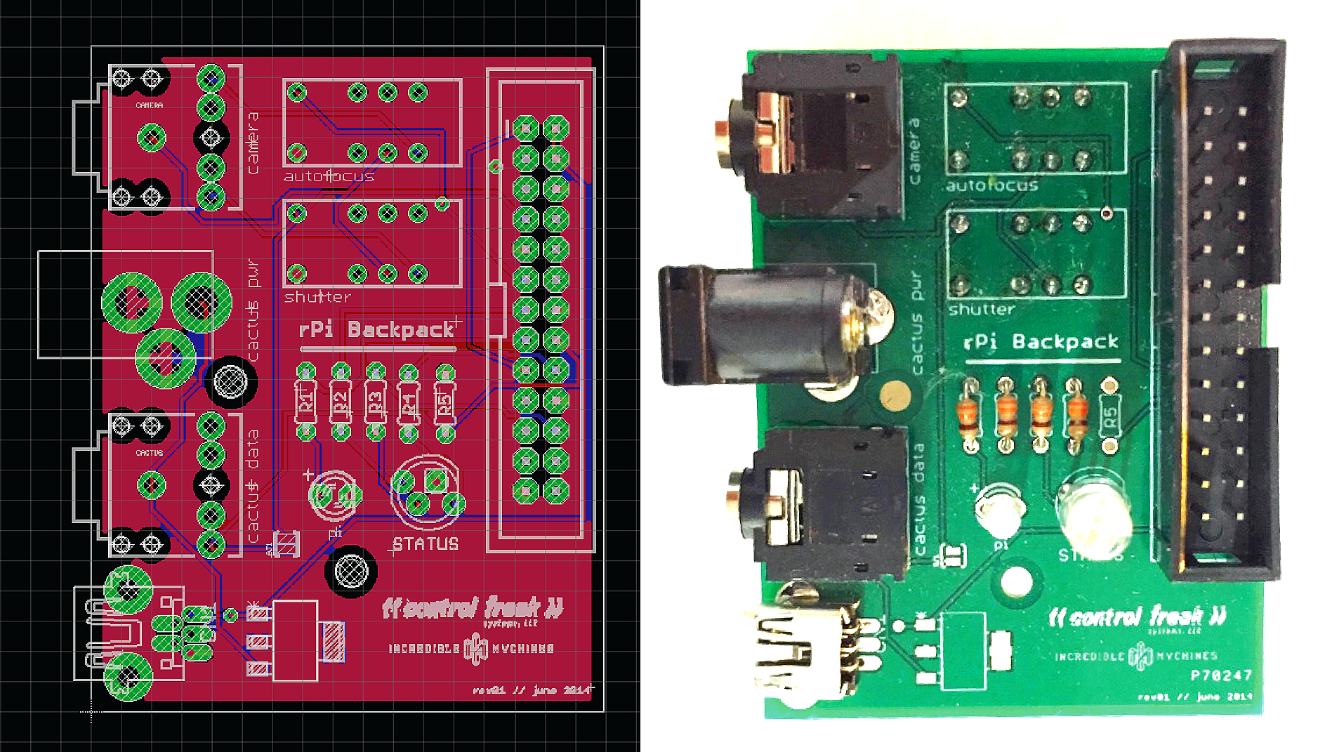 I designed a PCB to interface with the RPi's GPIO pinouts which triggered and autofocused the DSLR via it's shutter port, read an analog input from 3rd party laser/motion sensors, and provided LED status feedback. Each RPi was running a Node app listening for networked UDP commands, and transferring image data downloaded from it's camera after each capture.