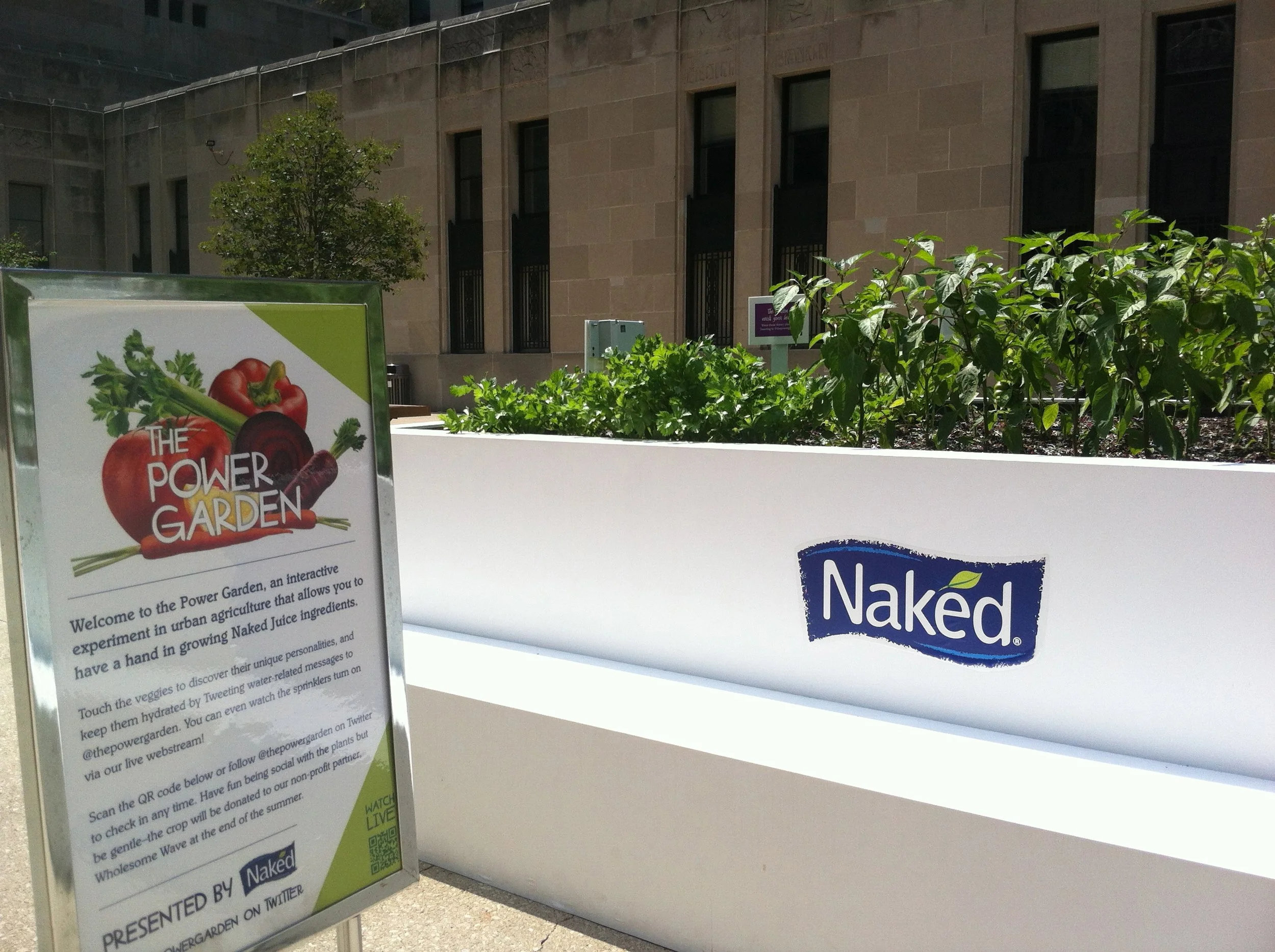 We (Incredible Machines) installed a literal garden in the middle of Riverside Plaza, a bustling commuter route in downtown Chicago. We grew 6 varieties of vegetables featured in the juice line, and used a combination of environmental, motion, and touch sensors along with Twitter data to shape its dynamic, living personality. The Power Garden sensed when people passed by and literally called out to them for on-site engagement, while also updating digital signage (Android tablets housed in custom enclosures) dynamically with fun facts about each veggie plot. Spectators had the most fun when they interacted with the vegetables – each veggie had a unique voice that responded to touch.